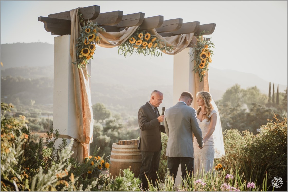 On September 30, 2017, Kyle and Lauren tied the knot at the gorgeous Davy Ranch in Ojai, California. What a dream wedding!!! The ceremony was held outside, underneath an elegant, rustic arch decorated with sunflowers. The view from the ranch overlooked the mountains and greenery, and California’s unique trees (like my favorite – those slender pointy trees seen all over SoCal – the Italian cypress, or Cupressus sempervirens). Cute rustic wedding signs were displayed all around. Everywhere you turned your head, there was a breathtaking view. The wedding flowers were sunflowers, and each one was placed intricately all around the ranch. It was a really warm atmosphere, with family and friends all around.