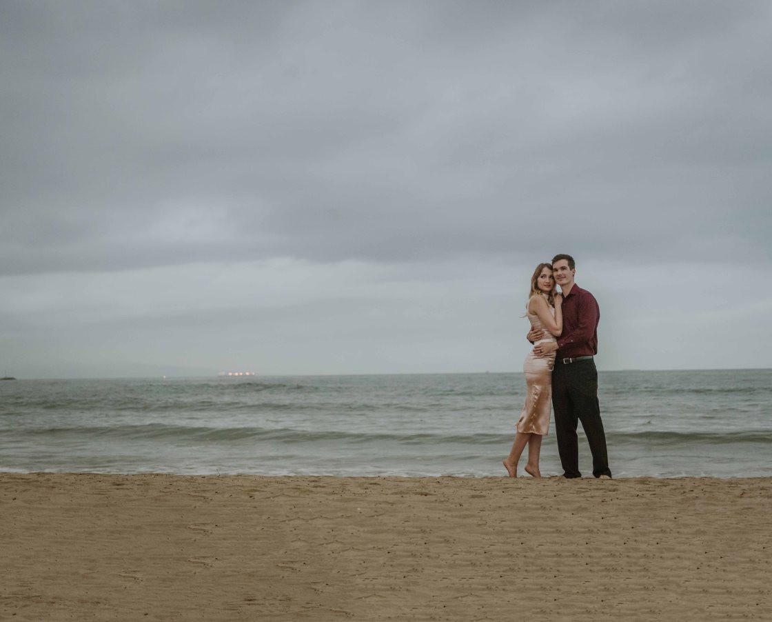 On one of the only stormy days in sunny California, I met a young couple in front of the iconic Venice Sign, for our Engagement Venice Beach photo session. You’ll see wedding rings on both of them, because they’ve actually been married for a year. But because they didn’t get professional engagement photos done before they got married, they were eager to get beautiful photos of the two of them, in love.