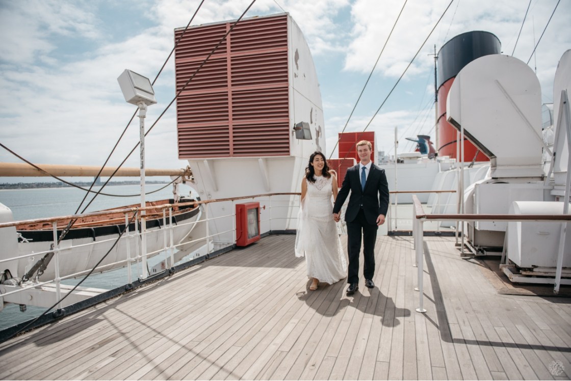 On June 16, 2018, Sarah and Mason got married at the Harborview Room at Reef Restaurant in Long Beach, California. The intimate wedding was filled with their closest family and friends, and I’m honored to have been chosen to photograph their big day. Sarah got ready in the morning at The Queen Mary, a 10 minute walk from the restaurant ballroom. While Sarah was putting on her wedding dress, I met Mason on the ship, and left him on the deck – to wait for his future bride to come down for the couple’s first look. His reaction was so sweet and their love was evident from that first moment (I hadn’t met the couple before, so it was my first time seeing the two together as well). The dress, the suit, the sparks, and the view – it was all breathtaking! After their quick look and adoration for each other, we all headed to the Reef Restaurant, where their family and friends were starting to arrive for their ceremony and reception.